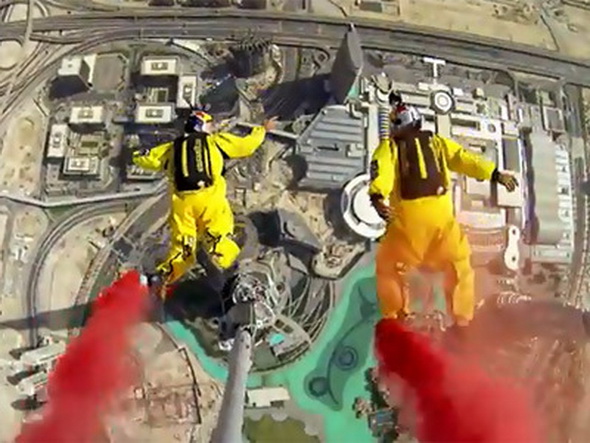 Прыгуны совершают прыжок в специальных летательных костюмах, а затем раскрывают парашюты. Выглядит это фантастически. Слабонервным рекомендуется не смотреть. Впрочем, спортсмены утверждают, что нисколько не боялись, когда вставали на край самого высокого здания в мире.